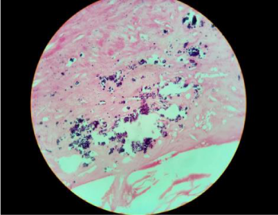 After surgery, the patient was NPO for 24 hours. Vital signs were normal. Blood pressure: 120/80, respiration 88 and temperature was 37 °C. Patients with oral cefixime and metronidazole was discharged 3 days after surgery. Surgical pathology was reported fibrohyalinized tissue with lymphangiectasis (Figure 1), calcification (Figure 2), cholesterol cleft formation (Figure 3).