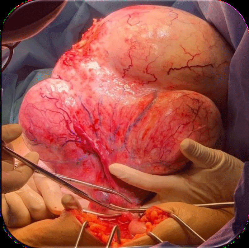 A pelvic ultrasound revealed a right ovarian mass with a dual solid-cystic component, measuring 26×15×10 cm and classified as ORADS 4. The left ovary was visualized, while the uterus was normal in size (6×5×4 cm) with a thickened endometrium (7 mm) and a thin layer of effusion in the pouch of Douglas. A TAP CT scan demonstrated a large tumor with cystic and solid components (26×21 cm) displacing the digestive tract, uterus, and bladder, along with effusion in the pouch of Douglas and discreet bilateral pleural effusion, but no signs of carcinosis. Laboratory results showed elevated CA-125 antigen levels (1693.60 IU/ml).