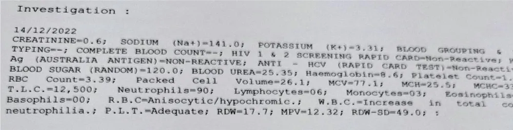 At the time of admission, her pulse was 102 beats/min, and her blood pressure was 110/70 mmHg. Her investigations, LFT, KFT, and complete blood count, were within normal limits. On admission, haemoglobin was 10 g/L, total leucocyte count was 10,900, and platelets were 1.7 lakh. Prothrombin time was 14, and INR was 1.0.