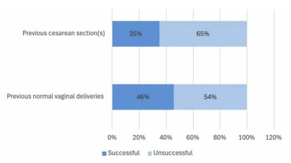 Figure 1b: Comparing the success rate of medical termination in patients who had previous vaginal deliveries to those who had previous cesarian sections.