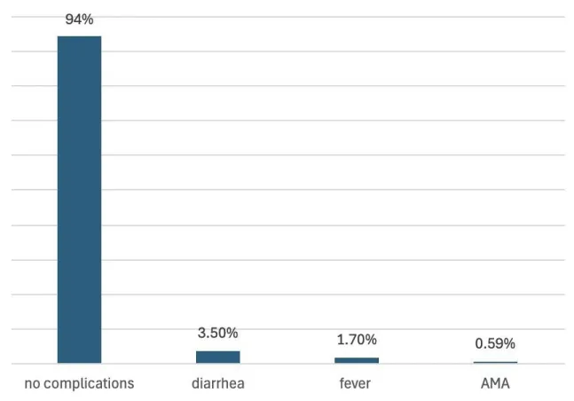 Ten patients (5.9%) who underwent medical termination had complications, 6 of them had diarrhea, 3 had experienced fever (two of which had a fever of 38 degrees, and one had 39.1), and only one patient had active vaginal bleeding that resulted in hypotension and was taken immediately for surgical evacuation. One patient refused continuation of medical termination and surgical evacuation, that patient signed against medical advice and left the hospital. Of those 10 patients, 4 of them had successful medical termination and the other 6 patients had incomplete miscarriage and had to undergo surgical evacuation of retained products of conception (Figure 2B). Only one patient refused total management, making the acceptance rate 99%.