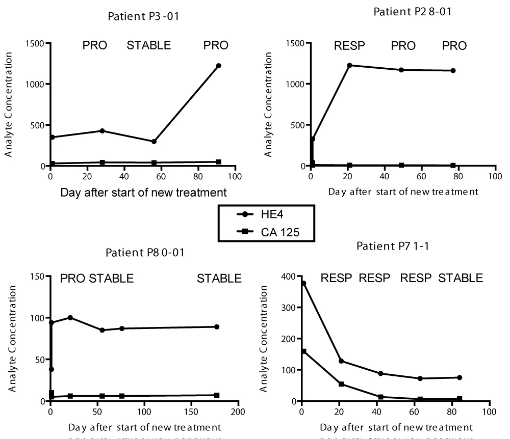 An additional analysis was performed to determine the lead time with which HE4 and CA125, alone or in combination, detected recurrence or progression of disease. For any set of longitudinal biomarker results for a given patient, a rise of > 25% above the nadir reached at or following the start of treatment was considered an indication of recurrence or progression.