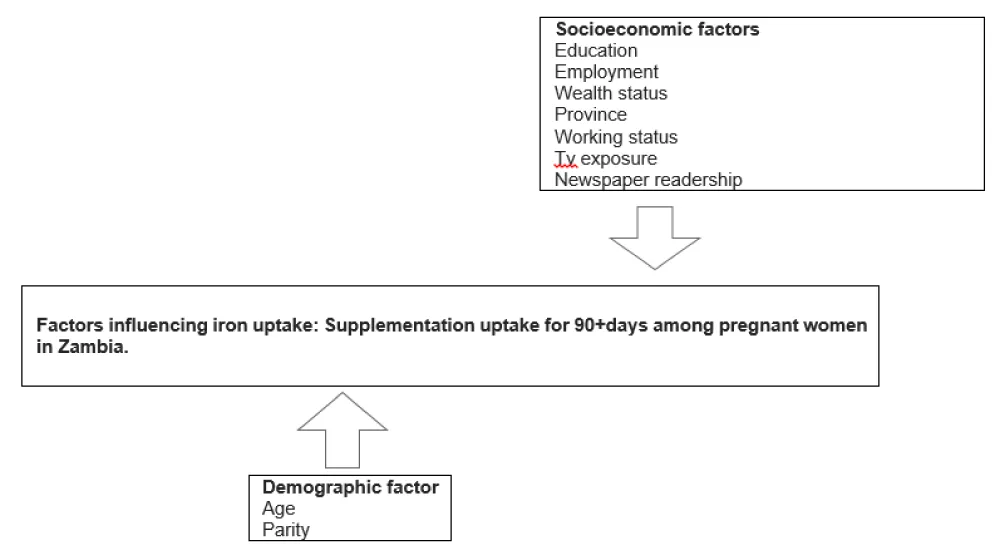 Figure 1: Conceptual framework on factors influencing Uptake of iron supplementation for 90+ days among pregnant women in Zambia.